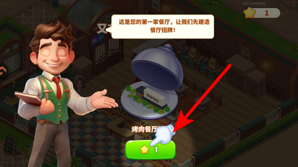 点击烤肉餐厅下方那个带有星星图标的绿色按钮,就能为第一家餐厅建造招牌啦。