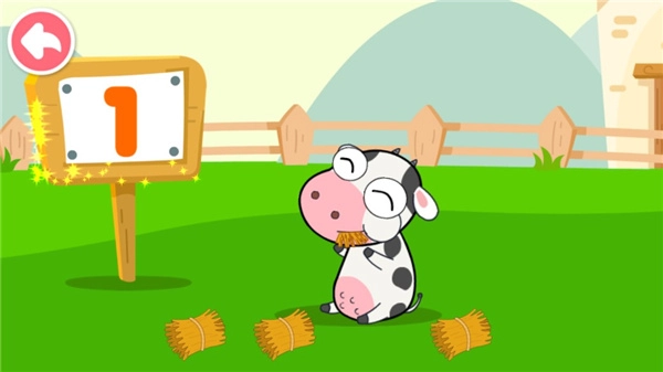 我们去小奶牛的农场看看吧,那里地上有四捆草,点击草垛喂奶牛就能了解识数的方法啦。