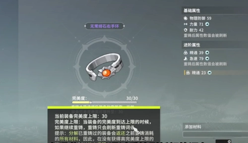更换之后,玩家依旧能够选择消耗重铸石,以此来提高手环的完美度或者属性。