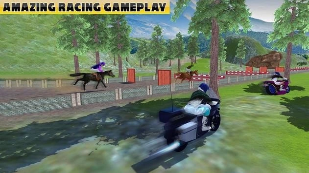 骑马比赛同样十分有趣,你可以参与跨栏项目,马的速度相当快,还能适应多种环境。比如在草地环境里,摩托车的速度反而会变慢,这时骑马就能拥有更快的速度。