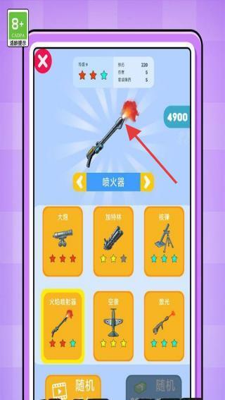 2. 在武器选择页面,挑选【喷火器】,支付4900进行解锁,随后查看它的属性,确认伤害等相关信息,为战斗准备合适的武器。