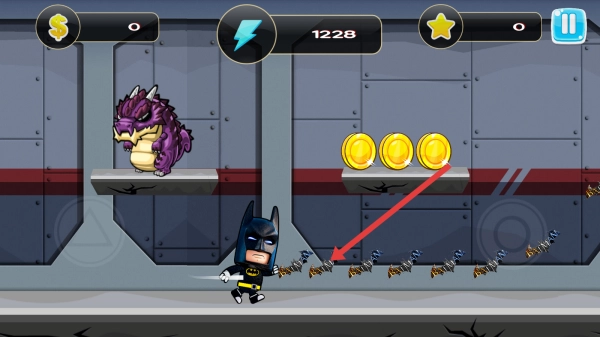 2、在跑酷游戏里,你要操控蝙蝠侠这个角色,顺着箭头指示的方向移动,同时收集金币,还要留意避开紫色怪兽之类的障碍,以此来积累资源。