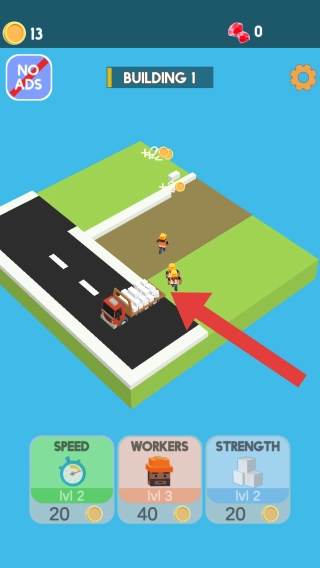 1、实体信息包含“BUILDING1”和“NOADS”,同时设有速度、工人、力量的升级界面,展现的是建筑施工的场景,属于休闲模拟建造类型,玩家能够通过升级相关属性来推动建筑进程。