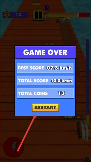 游戏失败后,会进入“GAME-OVER”界面,此时点击【RESTART】按钮,消耗一定数量的金币(例如13个),即可重新挑战该关卡。