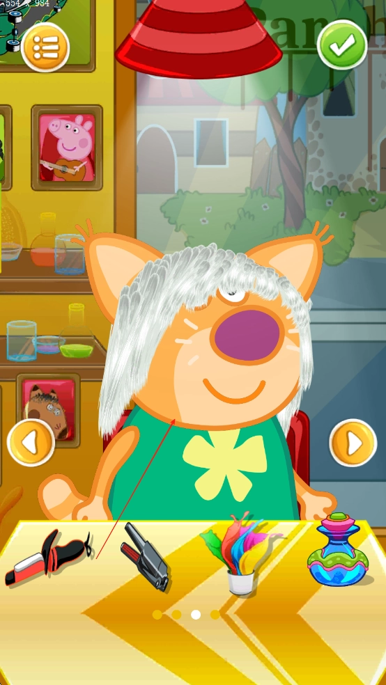 基础造型的操作方式很简单:用剪刀工具沿着虚线拖动就能修剪发型,长按染发剂可以涂抹指定区域,滑动屏幕还能旋转角色查看细节,这种便捷的触屏操作对低龄儿童来说很容易上手。