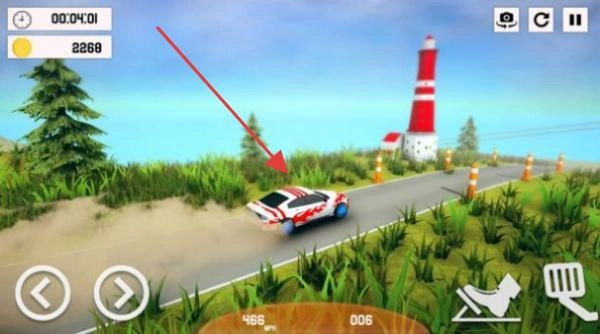 在海滨赛道上驾驶赛车,通过左右箭头按钮操控方向,沿着道路行进,留意计时和金币收集,躲开草丛,朝着灯塔的方向前进。