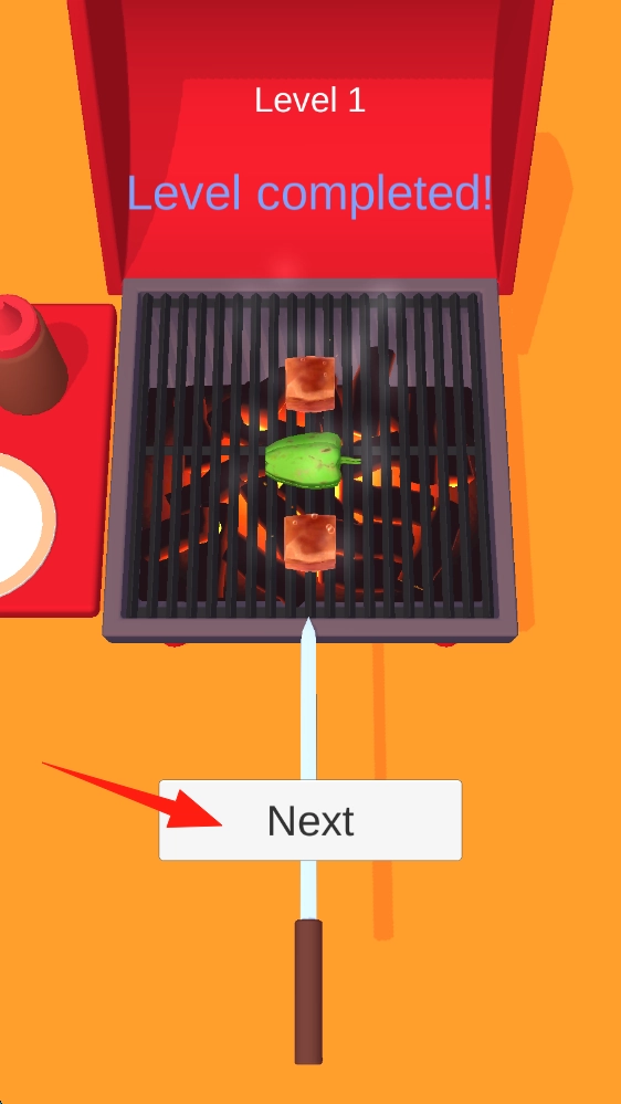Level-1完成后,点击Next按钮,进入下一关继续烧烤挑战,点击按钮进入下一步。