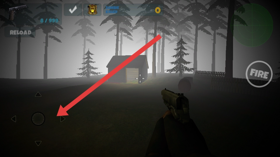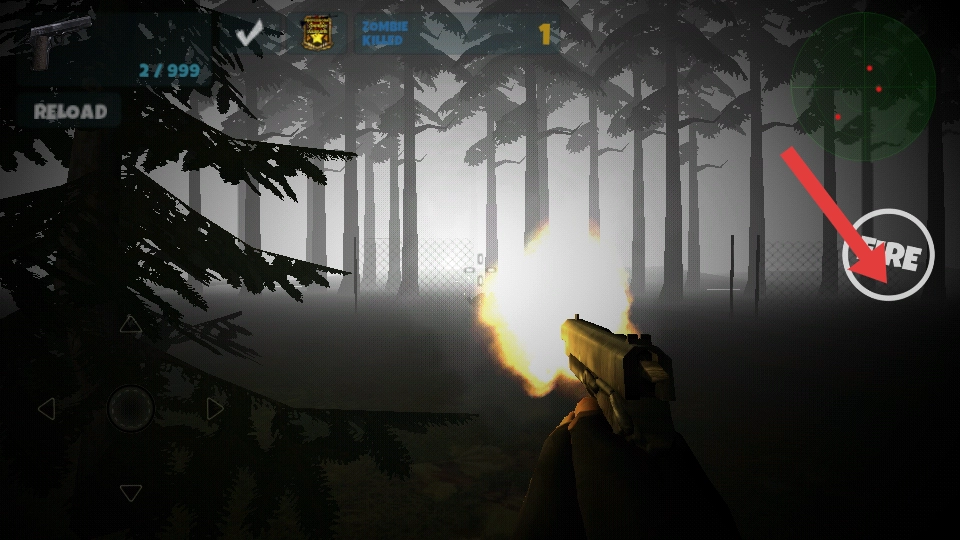 通过虚拟摇杆操控角色行动,在幽暗的森林场景里展开探索,搜寻僵尸的踪迹,为即将到来的战斗做好充分准备。
