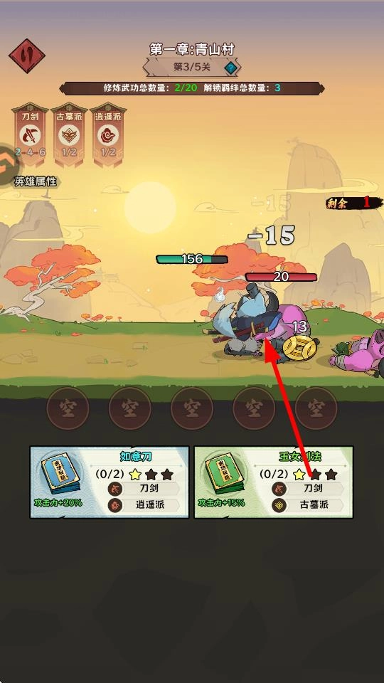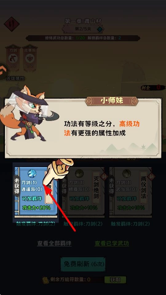 在后续战斗中,继续学习新功法如如意刀,通过组合不同功法的羁绊效果,增强角色战力,推进关卡进度。