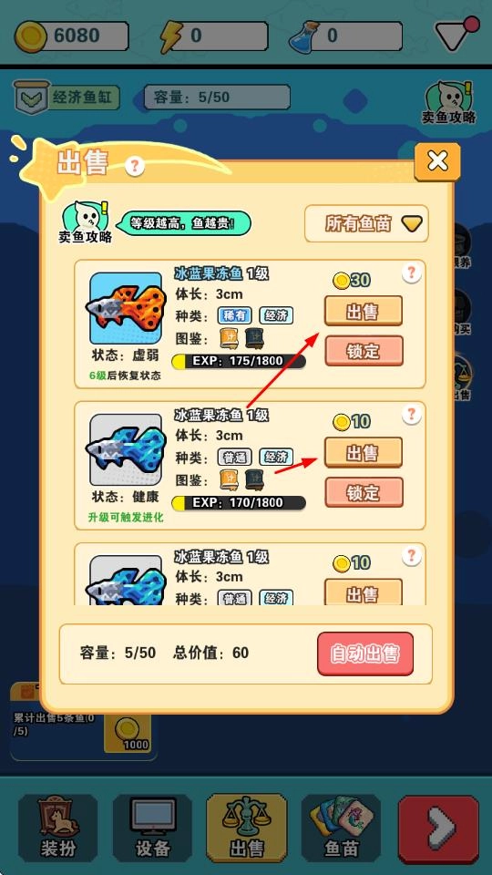 进入售卖界面后,把已经长大的鱼卖掉,就能获得金币奖励。鱼的等级越高,卖出去的价格也就越贵。