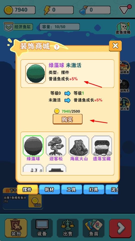 进入商店界面,用金币购买冰蓝果冻鱼、橙白小派鱼等鱼苗,为养鱼做好前期准备,开启你的养鱼之旅。
