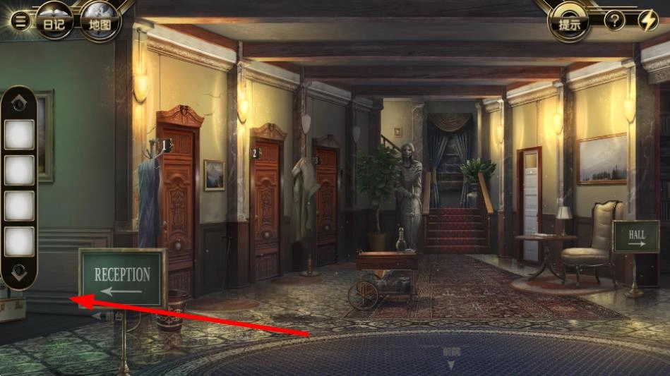 按照RECEPTION指示牌的指引前往接待处,场景之间的切换是解谜过程中的关键部分,各个场景里都藏着不同的道具与线索,能够助力推进解谜进程。