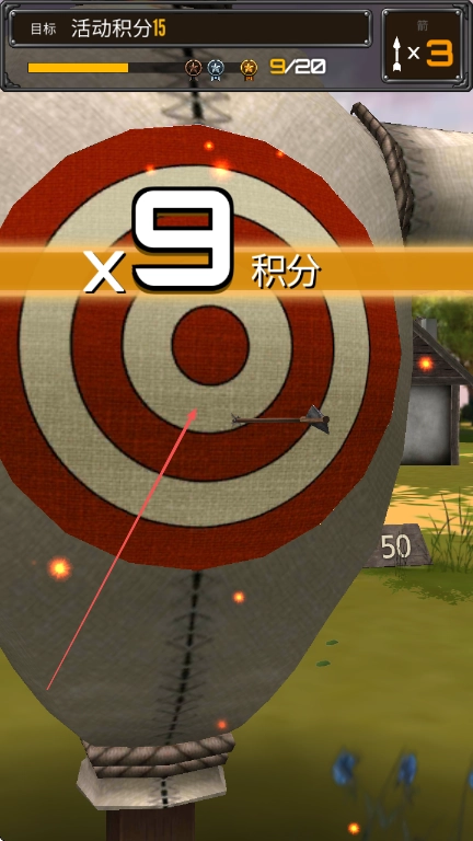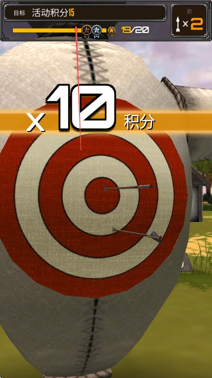 拉动弓弦对准靶心区域,松开箭矢进行射击,命中靶子就能得到对应的积分。