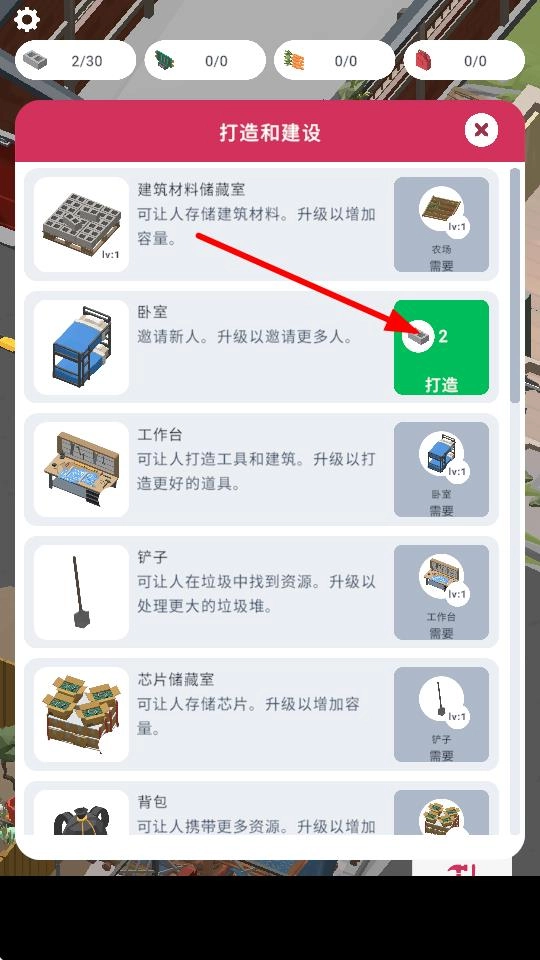 点击“修建卧室”选项即可启动建造流程,卧室建造完成后,你就能邀请新角色加入,以此拓展游戏里的人口与资源。