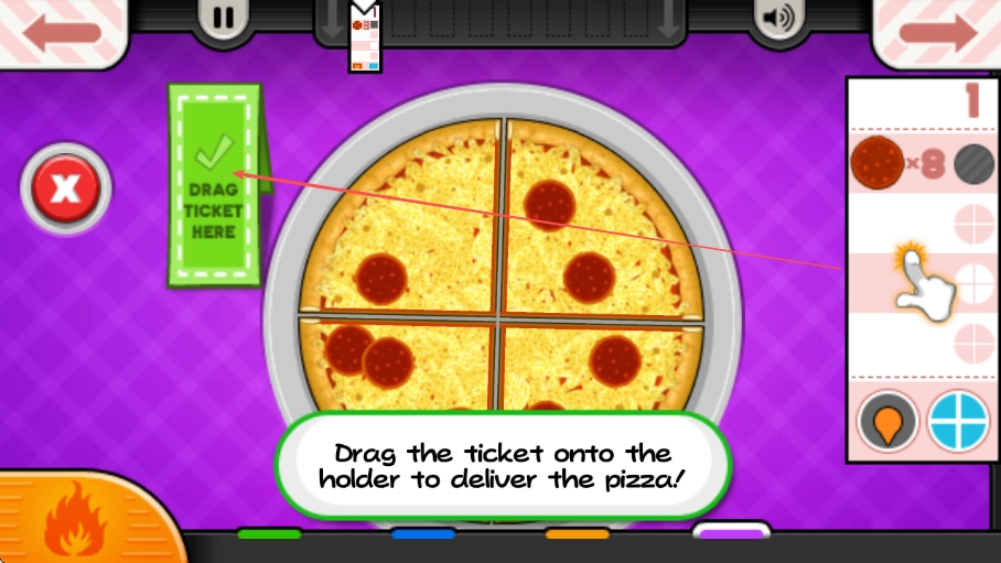 披萨切好后,按照提示“Drag the ticket onto the holder to deliver the pizza!”的指引,将订单票拖动到对应的位置,就能完成披萨的交付流程。