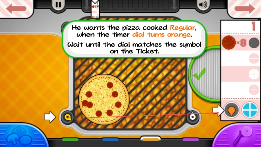 查看提示信息,按照要求把披萨放进烤炉,注意烤炉的定时器,当timerdial变为橙色时,披萨就达到了Regular的烤制程度。