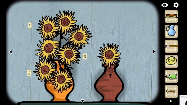 按照图中的顺序,依次点击左侧花瓶里从左到右的三朵向日葵,右侧窗台上那株正缓缓舒展的向日葵茎秆就会跟着向上抬升,最后托出一把小巧的【铜质小钥匙】
