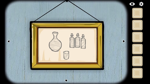 比对两组壁画的符号体系:上方三幅壁画分别对应【横纹=酒瓶=红酒】、【竖纹=水壶=清水】、【斜纹=苦艾瓶=苦艾酒】;下方壁画的顺序提示了操作流程——需按照顺序向桌面的三只容器依次注入【红酒】【苦艾酒】【清水】【红酒】【苦艾酒】,若顺序出现偏差,机关将被重置。