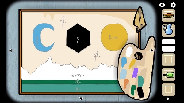 调色盘解谜:根据之前收集到的六组“底色+字母”组合(浅蓝/gl、深绿/d、蓝/g、黄/hn、白/wm、绿/na),请用【画笔】蘸取对应的色块颜料,在灰门后的油画草图上进行精准填涂。操作时需注意:先选择颜料罐,再在目标区域轻轻扫过完成涂抹,系统会自动识别饱和度并锁定填色状态。最后,用【黑色颜料】将中央六边形区域完全覆盖,即可触发【黑方块】的生成。