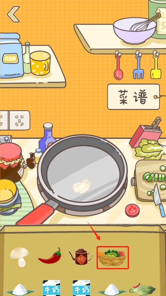 在食材区域,点击篮子形状的图标,挑选食材添加到锅里来进行烹饪。