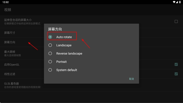 3、然后找到屏幕方向,选择Auto rotate即可在游戏启动后自动转屏为横屏。