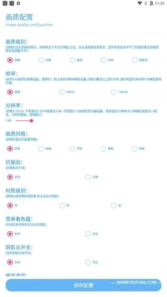 4、点击完成后我们能够看到很多的配置,包括画质、帧率、分辨率、画质风格等等。你可以根据你的需求配置。