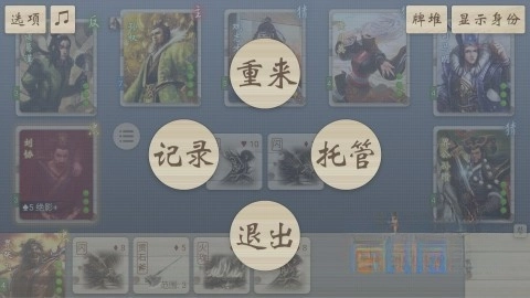 游戏中有一个含有功能选项的【三条杠】图标,提供重来、记录、托管和退出等功能,