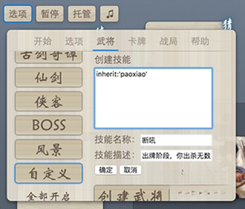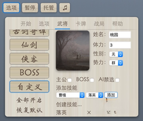 创造自己的武将与技能,从而增强游戏体验。首先武将名和头像为必填项,更改武将名将视为创建新武将。
