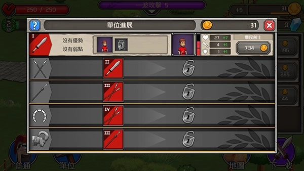 游戏里最初只有普通士兵这一种基础单位,当它升级到特定等级后会发生“进阶”,衍生出其他兵种,此时玩家有两种不同的选择方向:一是第一列的MILITIA(自卫队),这个兵种没有突出的优势,但也不存在明显短板,属于表现均衡的类型;二是第三列的SPEARMAN(矛兵),该兵种对部分特定兵种作战时能获得属性加成,不过同时也会被另一些兵种克制。随着游戏进程中兵种的持续升级,我们会逐步解锁更多类型的士兵单位,这时选择派遣哪种士兵出战就变得至关重要,需要根据敌方所使用的兵种类型来针对性地部署我方兵力。