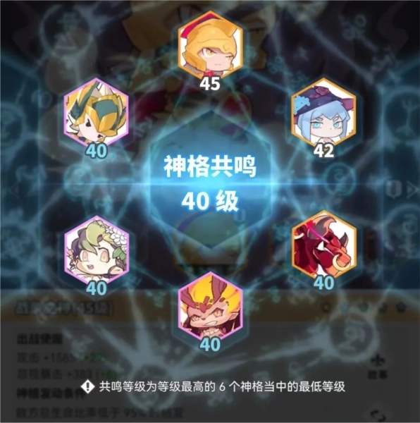 共鸣规则如下:需从全部神格中挑选出等级排名前六的神格,然后以这六个神格里等级最低的那个作为基准,来确定其他神格的共鸣等级。所以,只要着重培养这六个神格,其余神格就能共享相应的等级。
