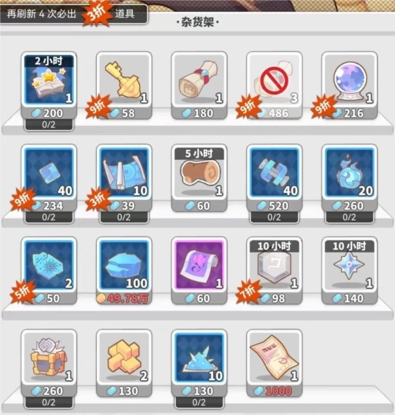 功能解析:杂货架购买的商品需消耗钻石和金币,每天5点刷新。