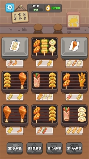 玩家能够借助指尖操作,把各类诱人烤串进行完美摆盘,感受烧烤摊的快节奏挑战。
