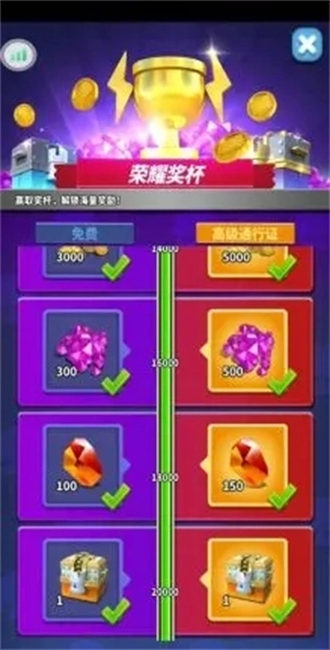 小孩子才纠结选哪个,成年人的态度是:竞技、合作我全都要!!!大家能看到这个竞技奖杯上设置了不少……奖励,前5000奖杯能免费拿,开通高级通行证后,5001到20000奖杯每个赛季都能领,不用额外再花钱,真称得上是一次投入,长期受益。