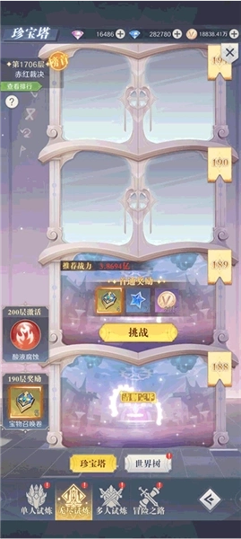 介绍:世界树的挑战需逐层进行,层数越高,对玩家战力的要求就越大,唯有满足战力条件方可通关。