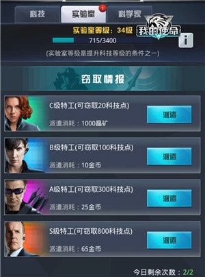 首先是科技方面,科技等级会同时受到研究所和实验室等级的双重制约。研究所等级提升只需消耗资源,而实验室等级的提升则需要用到科技点。玩家可以通过完成每日任务、窃取情报、获取军衔奖励等途径来获得科技点。