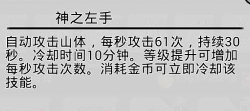 移山技能能提升普通点击的效率,玩家先在商店学习或升级该技能,之后就能在移山界面使用了。这个技能包含攻击力翻倍、自动攻击等效果,还有技能效果翻倍这类特别的技能,玩家得亲自体验一番,才能体会到它有多奇特。