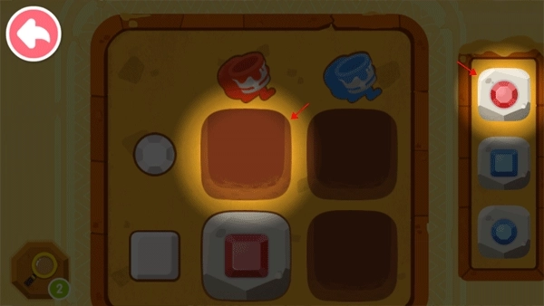 3、玩家需要依据左上方显示的对应左边图案的颜色,以及左边区域左侧所指示的应放入小坑的图形,把图形放置到正确位置即可通关。