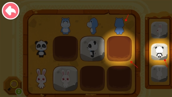 5、玩家需依据动物的朝向(正面、侧面、后面),左侧对应的是放置小坑的小动物,将其放到正确位置就能进入下一关。