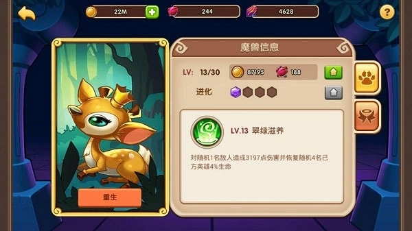 3、单纯善良的小鹿——达因,来自森林的它不仅能对敌人造成大量伤害,还拥有为己方英雄恢复生命值的技能。