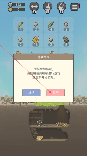 4、当无法继续移动合成时,点击 “重来” 按钮重新布局,或使用道具延续挑战,冲击更高分数与合成目标。