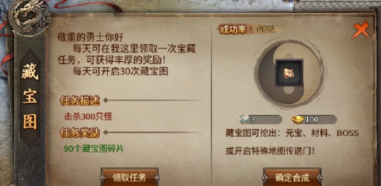 2、完成新手引导任务后,接着去领取藏宝图任务。之后根据自身战力进入对应的地图击杀小怪,累计消灭300只小怪就能完成该任务。获得的藏宝图碎片可前往藏宝图NPC处合成完整藏宝图,开启藏宝图将有机会获取大量元宝、灵符以及各类材料!