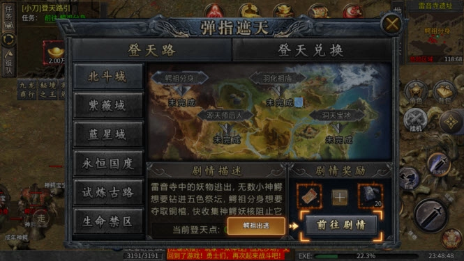 2、开启剧情主线:登天路后跟随主线任务完成探索。
