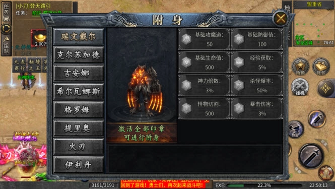 2、附身玩法:收集全部印章后,即可解锁附身功能,从而获取强大的属性加成。