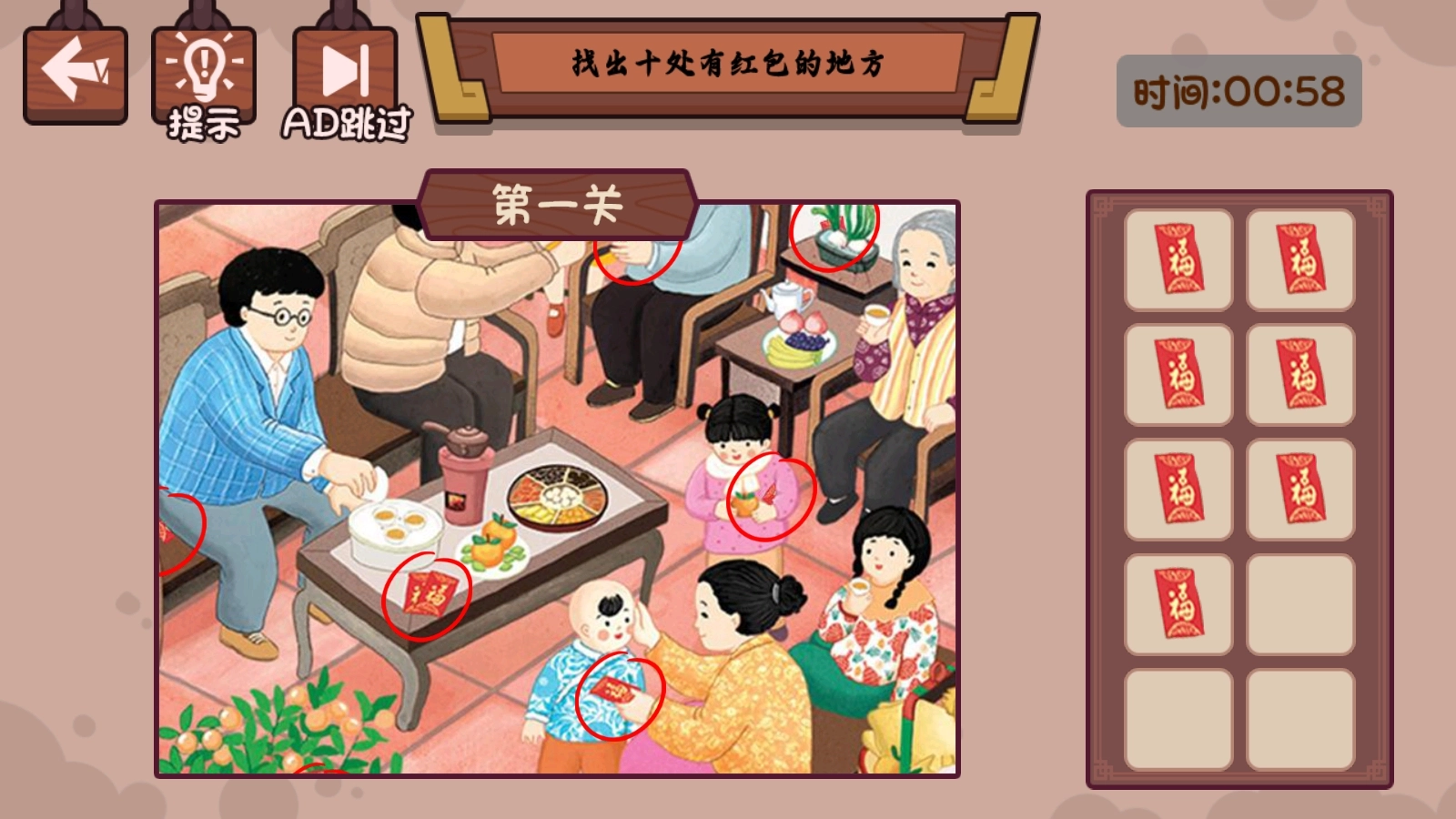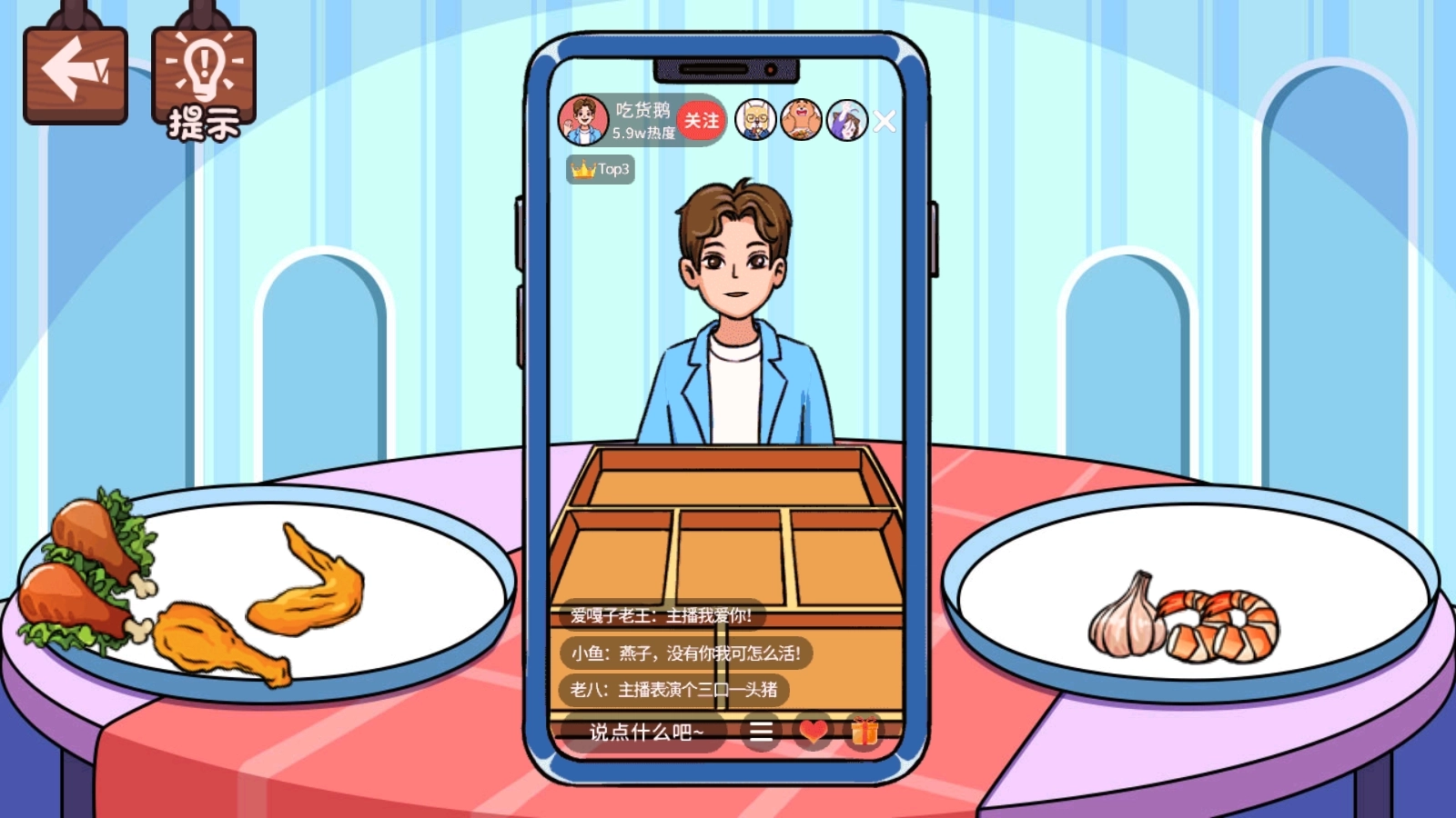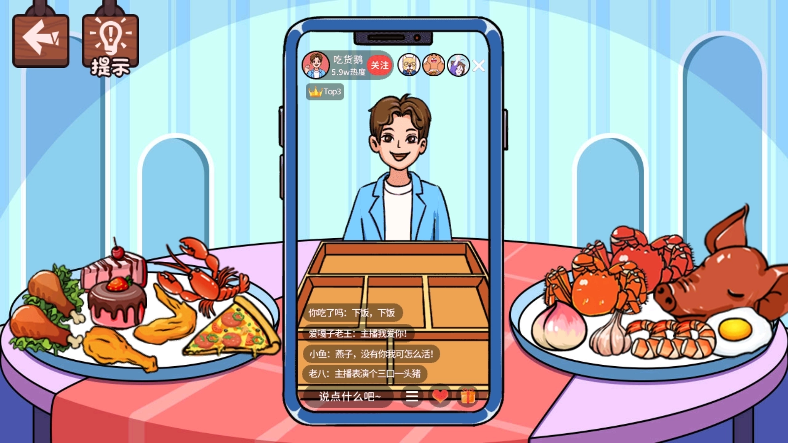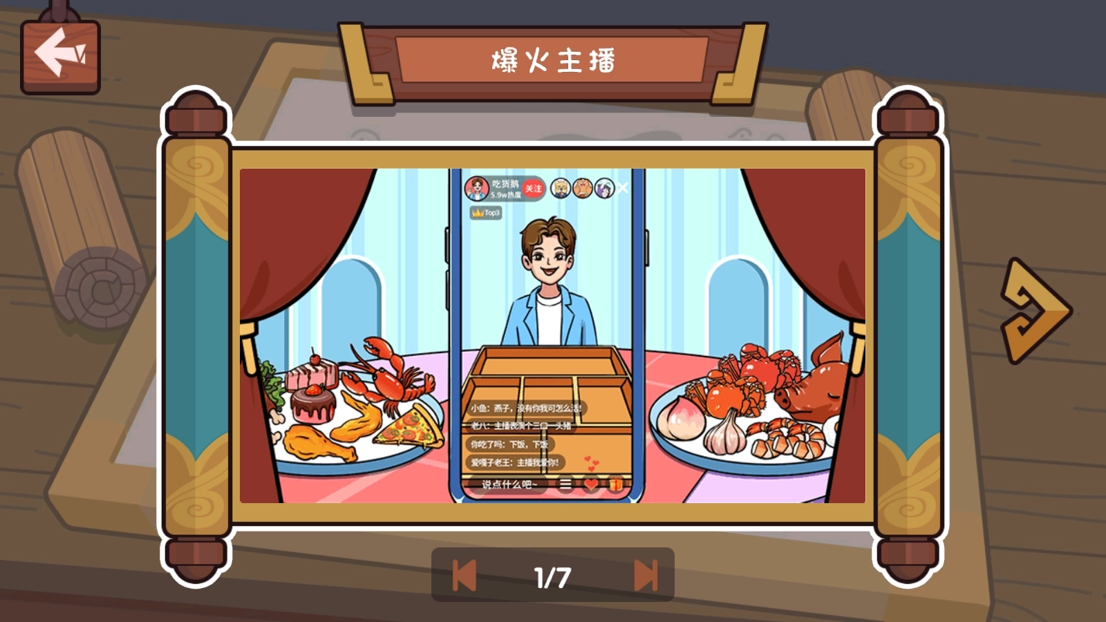 1.在“爆火主播”这一关卡中,能看到手机屏幕里有个男生,他身旁摆放着不少食物。