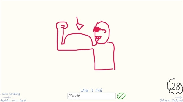 下一位玩家要猜出这幅画所代表的单词,接着由另一个人把这个单词再画出来!就这样循环下去,如果最后一位玩家猜对了最初的那个单词,就能获得奖杯!三轮游戏结束后,获得奖杯数量最多的选手即为获胜者!不过这并非游戏最有趣的地方,你很快就会发现,自己精心绘制的图画完全被别人误解了呢 ;-)