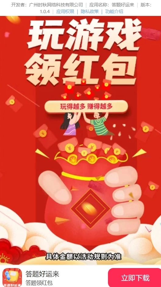 答题好运来赚钱版是广州时秋网络科技有限公司精心打造的精品之作,它设置了趣味答题的全新玩法模式,福利好运满满,惊喜接连不断。每一次答题通关都有随机红包,让你成就感十足,答题赚钱的全新旅程就从这里开启吧!