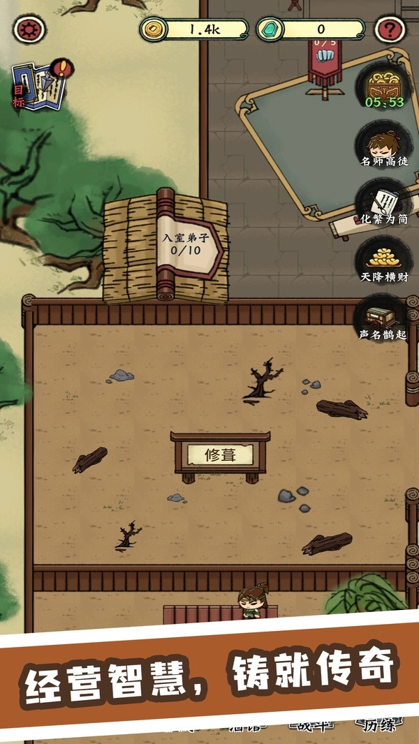 3、玩家需要招募并培训学徒,对场馆进行扩建,以此吸引更多弟子加入;凭借自身的智慧与不懈努力,让曾经辉煌的武馆重新焕发光彩。