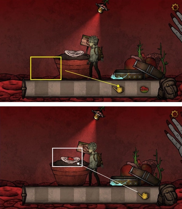 7、把玫瑰花递给女人,再把它放进嘴里,接着从白框位置取到一个蚕蛹,将蚕蛹放进机器中,启动机器得到绿色燃料,然后把燃料倒入右边的灯具里,就能得到一盏发光的灯。