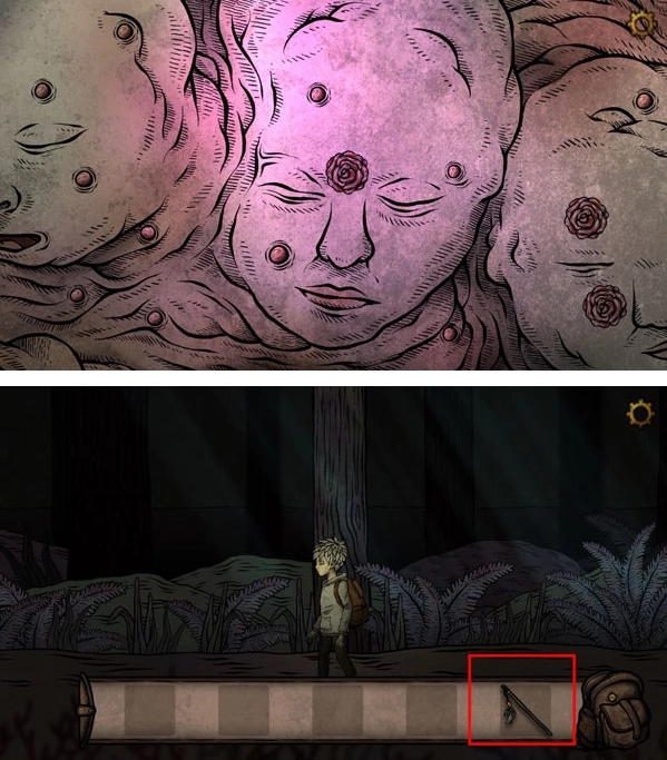 2、醒来后发现自己在柜子里,一路向右走,遇到一位穿紫衣的女人,和她对话后把对应的符号移到魔法球上,随后进入特定场景,在红框标注的位置拿起金针。