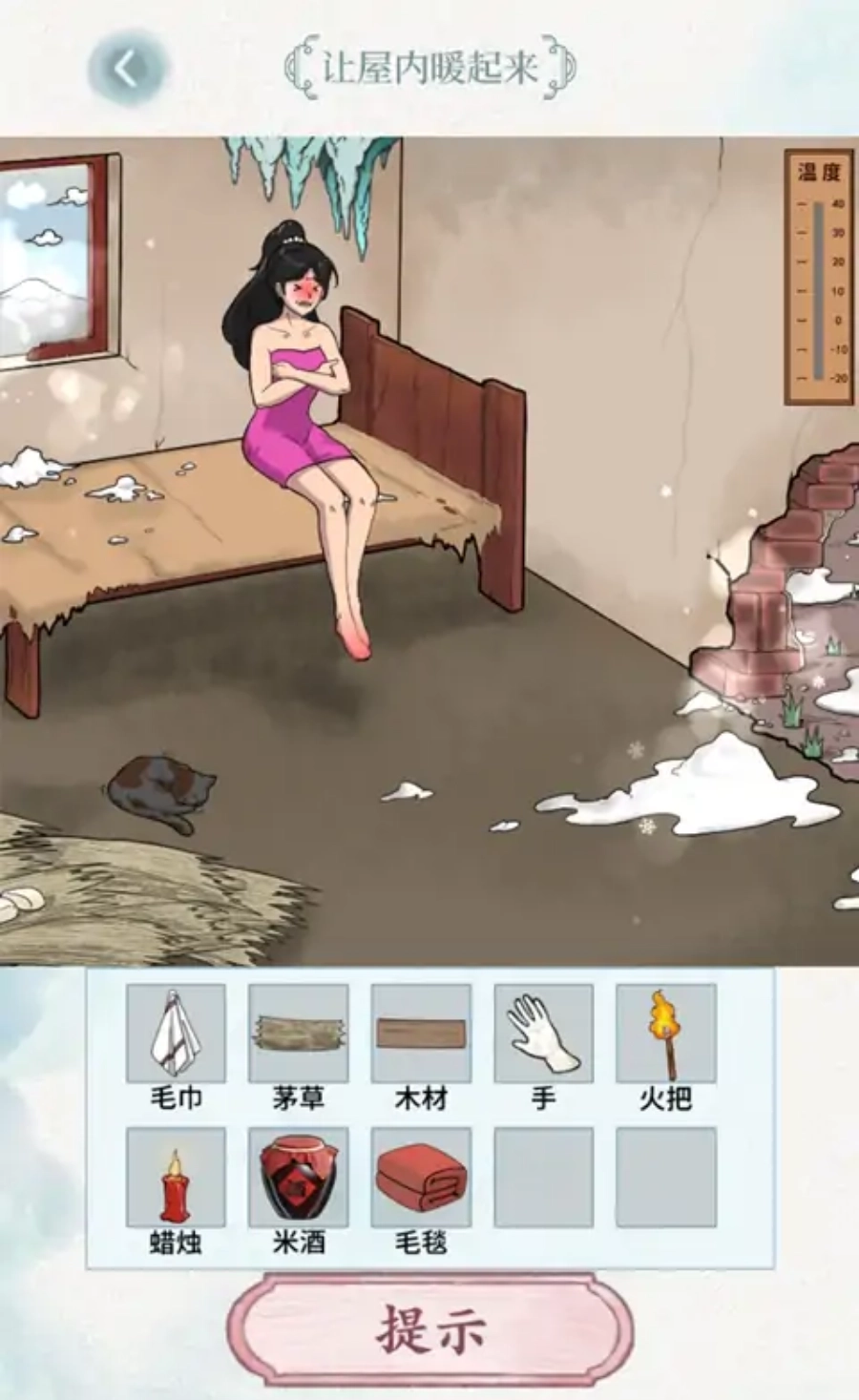 2、在那间破旧的屋子里,此刻女主正受着寒冷的侵袭,你打算怎样借助这些道具来为她取暖呢?